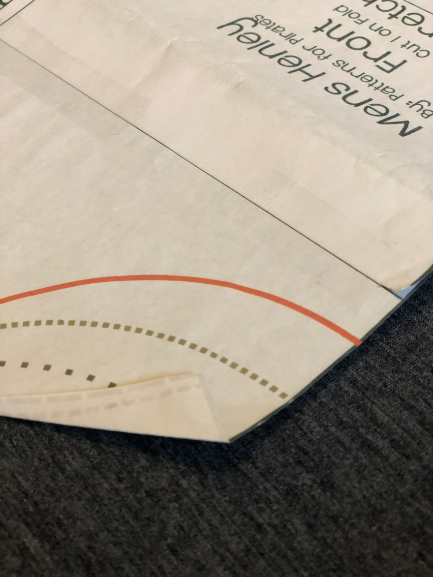 I started with the basic version of this pattern, only changing the neckline. The first thing I did was change the cut in the front of the shirt. I usually just fold patterns when I am trying to alter them rather then cutting the actual pattern or retracing it. #lazy #ifitworksworkit I folded the pattern so it came to a point for the V Neck down to the size below his (so the neckline will be a little lower then a normal crew cut).