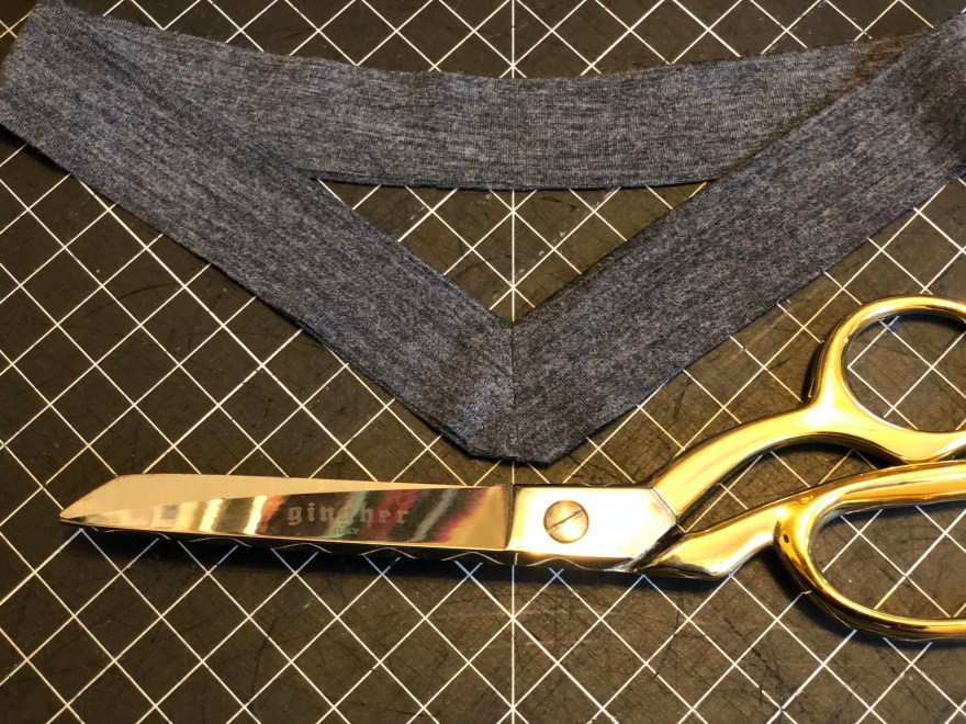 Next I made my V Neck pattern piece. I actually used a separate piece of paper of this since its a different shape and size I found that easiest. I measured the neck opening and multiplied it by .85 to find out how long to make it, and I did 2 inch width. Then I cut a V onto the end (make a dot in the middle of your piece, 1 inch from the end and connect the dot to the two corners). Done! Now cut your V neck band.