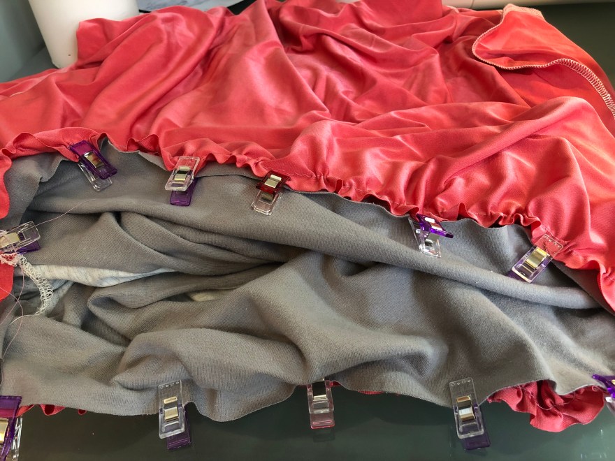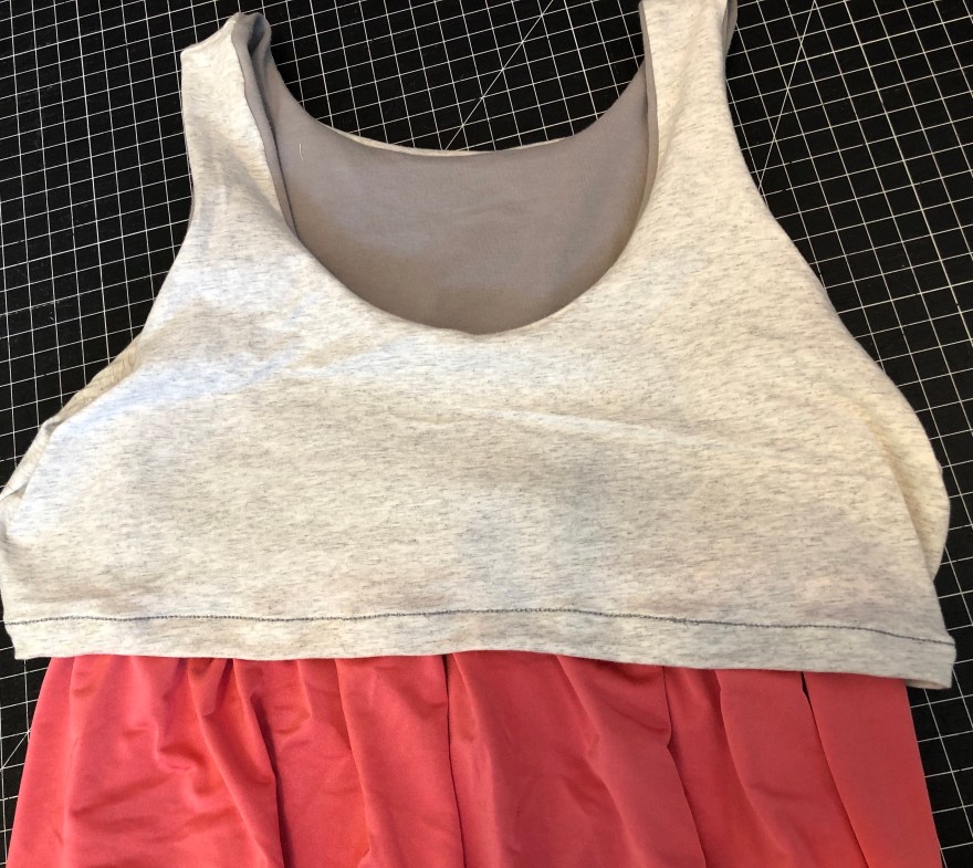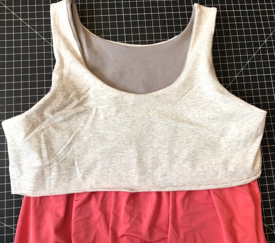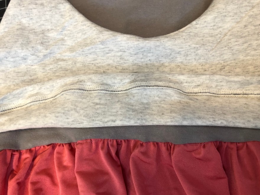 I recommend adding clear elastic in the hem of the outside bodice so that it doesn’t get stretched out. I serged mine on first then turned and hemmed. This clear elastic works great and is a great price on amazon (and it comes on a spool which I love!) and… Viola! Your done!