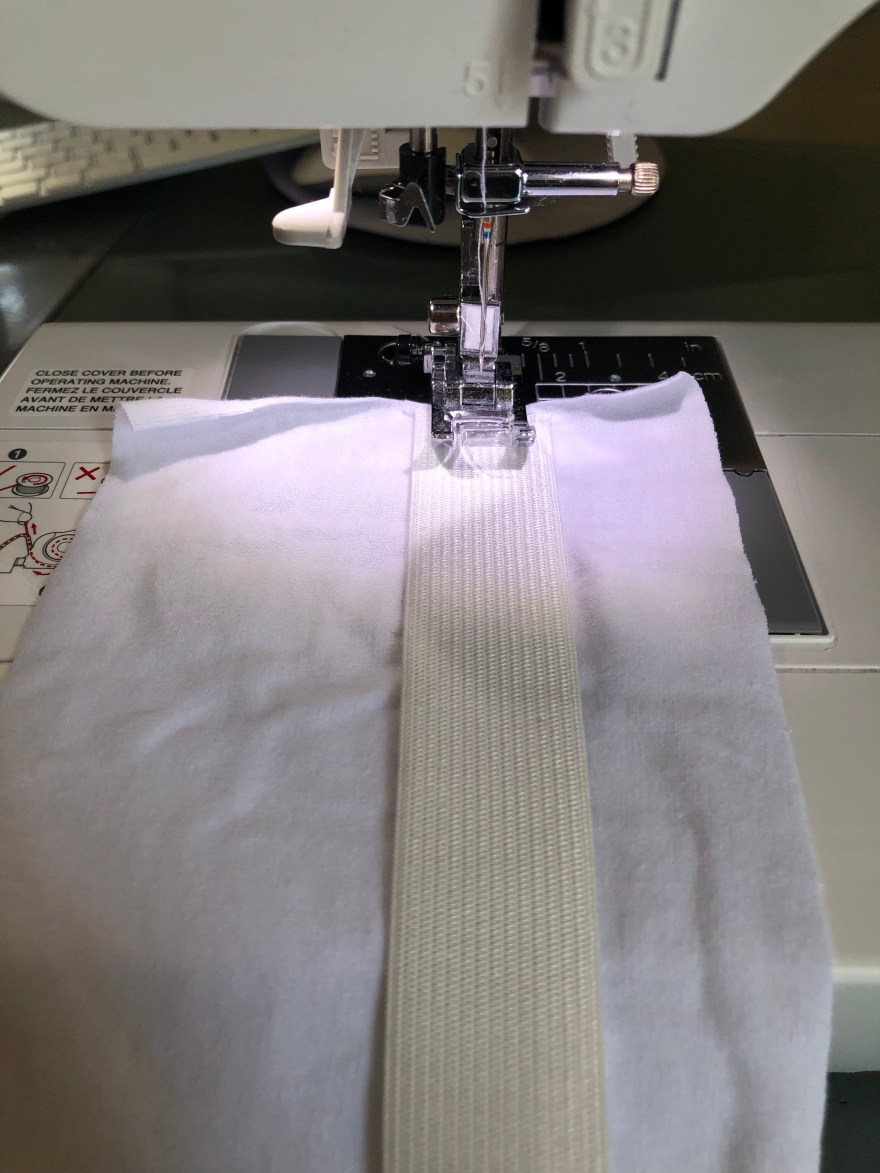 Then cut the band and elastic for the band according to the directions. I like to sew my elastic to the band so that it doesn’t flip when I’m putting it on. I place it slightly off center and use a zigzag stitch down the whole way. Then I sew the side seams together creating one continuous circle.