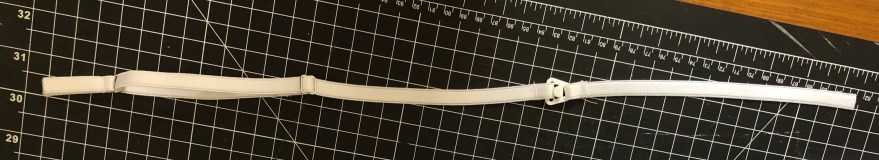 Thread the 2.5″ strips into the bottom of the nursing clips, fold in half and sew it together. Thread the 3″ strips into the rings, fold in half and sew together. Once each strap is assembled it should look like this. Now place it aside briefly while we work on the lining.