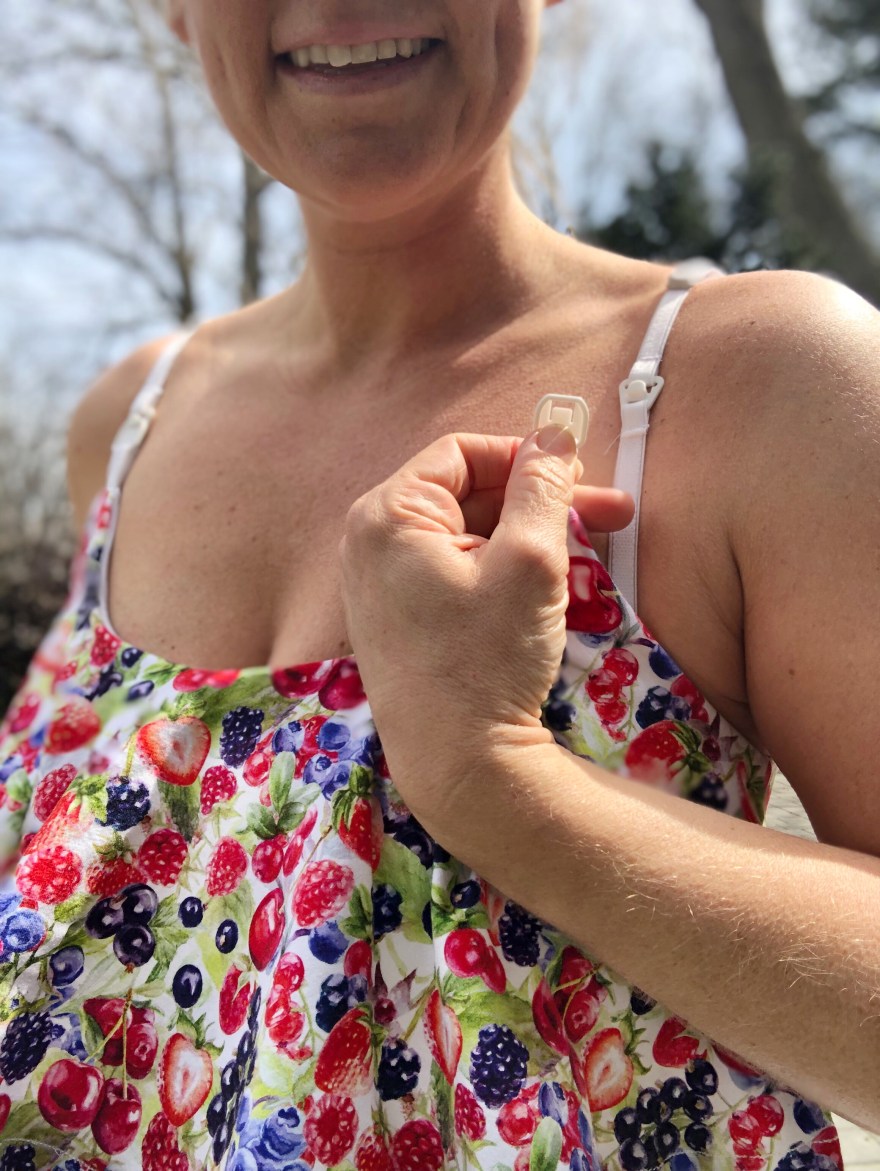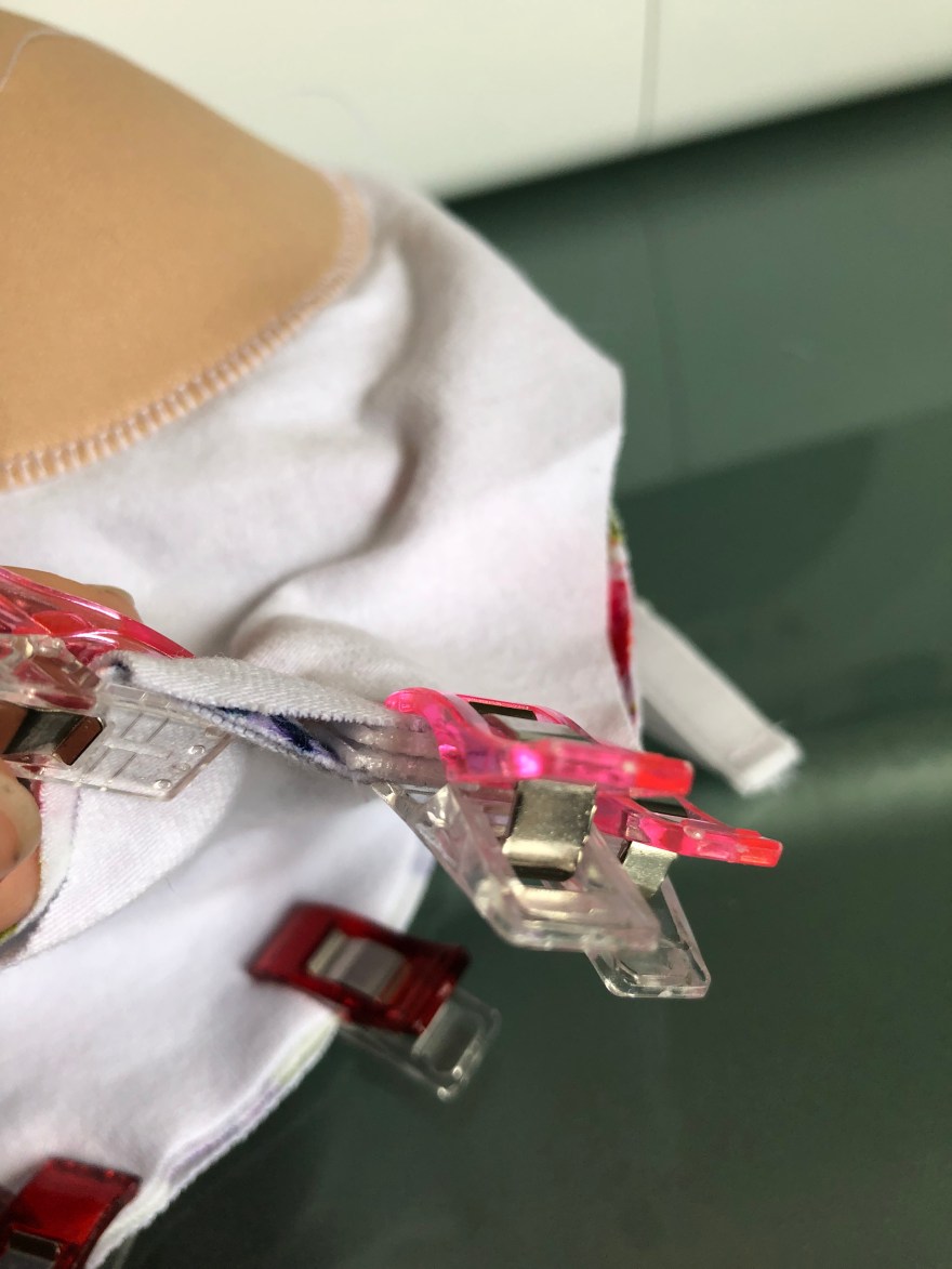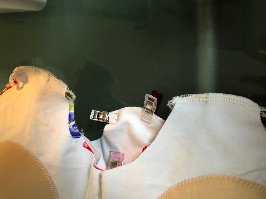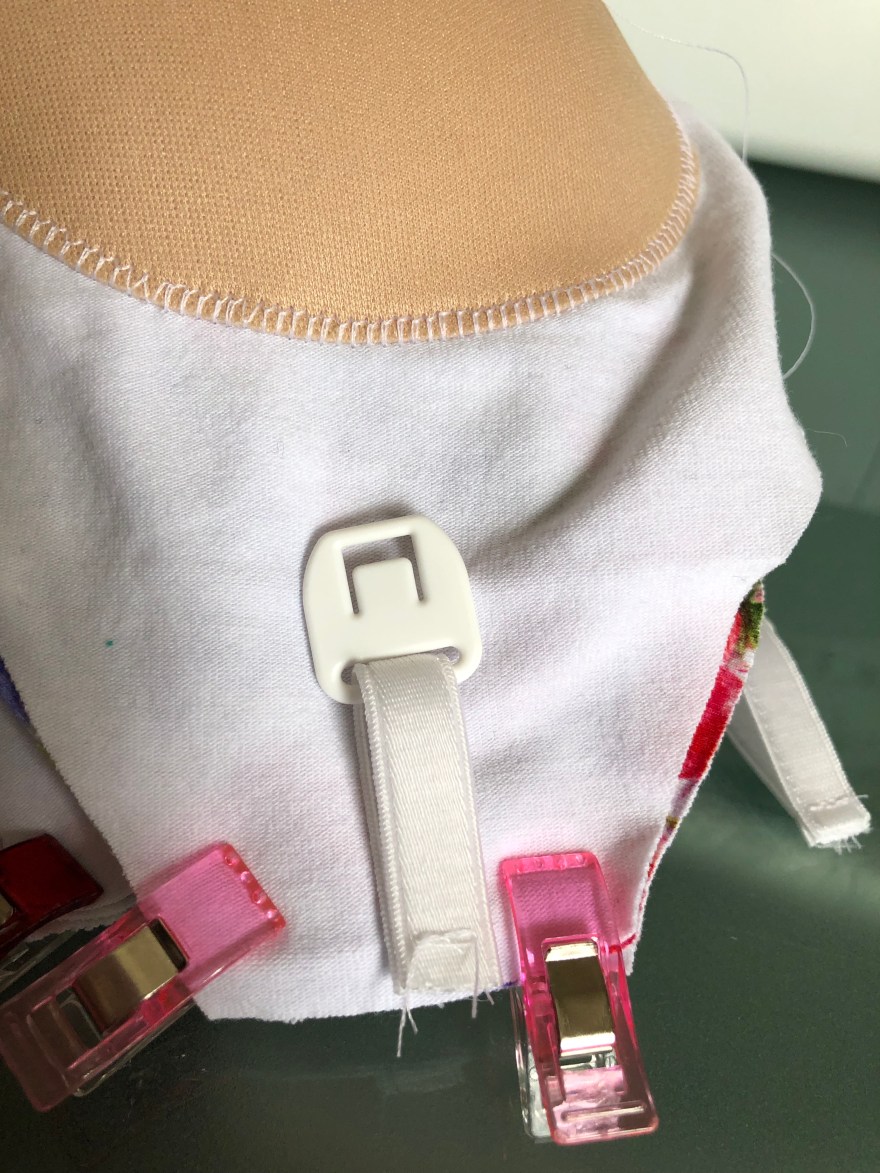 Now attach the lining, flounce, and main according to the pattern – mostly. Add the front bra clips (facing downwards, I took a picture of them outside to show you, but place it in-between the lining and flounce). I like to sew these front straps first before going around the rest of the top. Don’t sew the back bra strap piece yet!