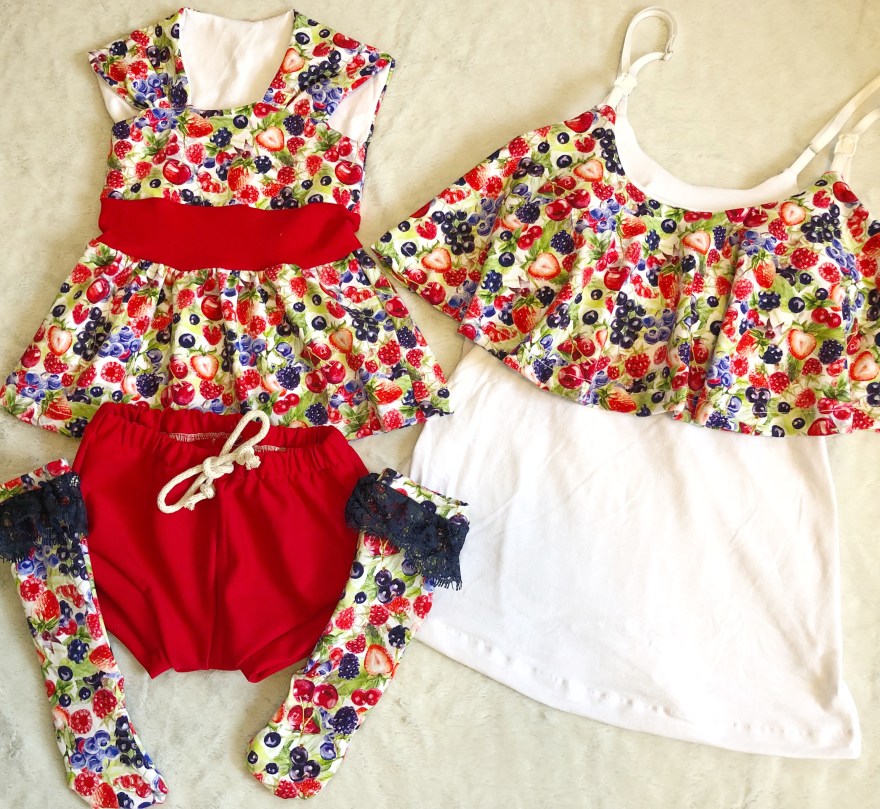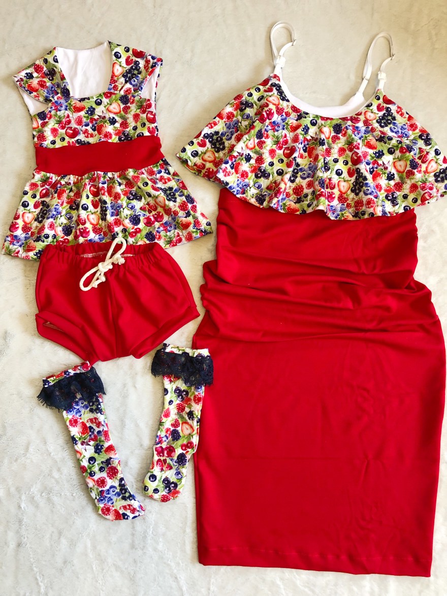 I had this awesome CL (cotton Lycra) Berries strike from Snowy Owl Fabrics that I feel in love with. Its got some great detailing on the print and vibrant yet vintage looking colors. I paired it with a scraps from a red Ponte I had in my stash. I knew I wanted to do something Mommy and Me. I love making more coordinating outfits rather then completely matching. This way I get to play with patters more and create more unique looks.
