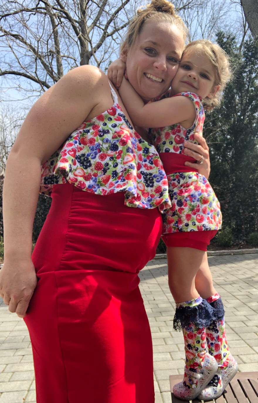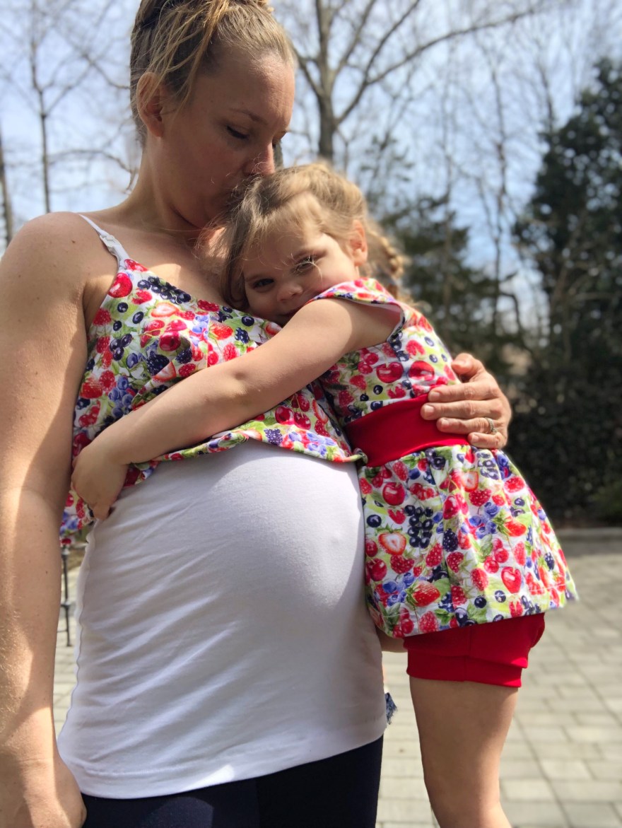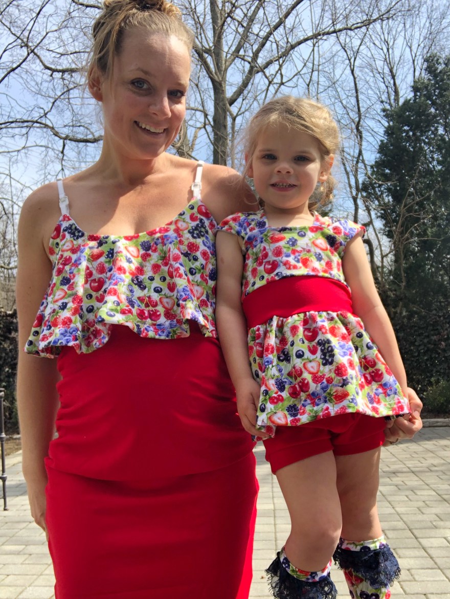 Now onto mama’s outfit! I had made the red Ponte pencil skirt using the free P4P pencil skirt in a previous post. You can see how I modified it for maternity here. The top is based on the Siren Swim Top by P4P. The flounce piece I cut and assembled according to the pattern.