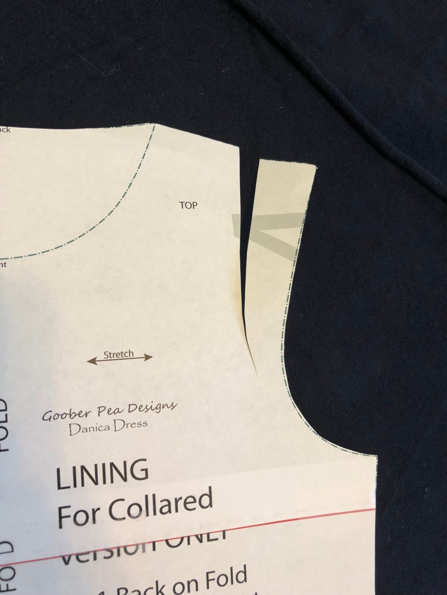 I used the lining piece as my bodice. I cut the shoulder seam a bit so that it sits a little higher up on the shoulder. Trick: I don’t cut it all the way so that I can fold it and still keep my pattern piece all together. It makes it easier to adjust it both ways in the future. I cut out a main front and back, and a lining front and back (for this dress I did both in the solid navy).