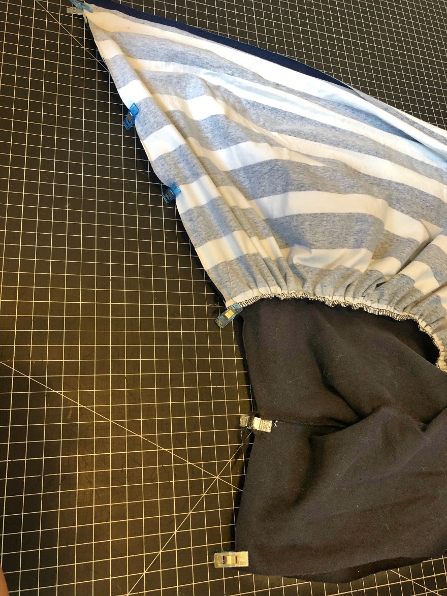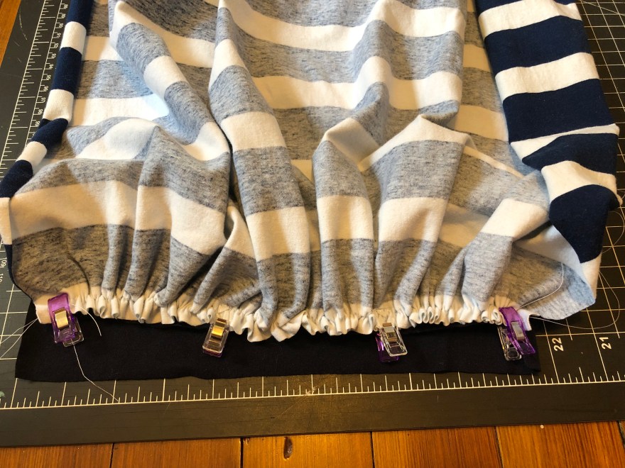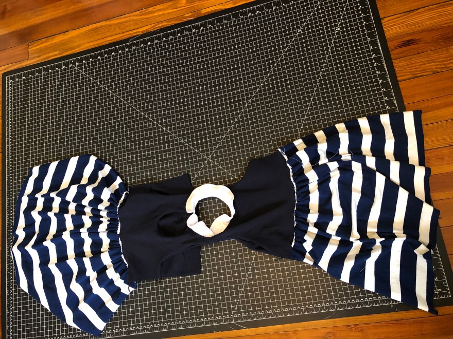 Then I followed the directions for cutting the collar. I used a knit fabric and I didn’t use interfacing. I definitely would recommend using interfacing so that the collar doesn’t get wavy. When I make this again I will absolutely add interfacing because this collar did get a little wavy, I’m hoping a good press will help reduce it for this one.
