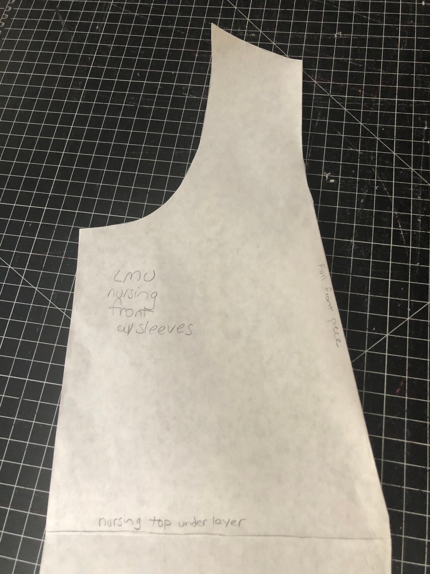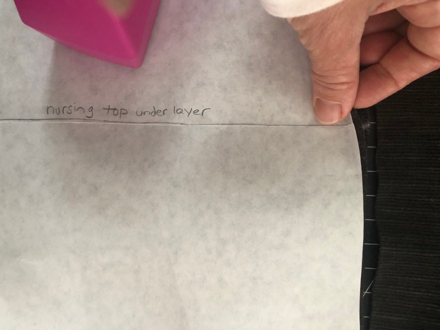 When cutting your fabric you will cut two pieces from this front piece, one is the true long front and the other is the underneath area that stops at the line you made. I like using the same fabric for both that way the nursing access is less noticeable. When cutting your long front piece be sure to mark where your nursing line for the under layer is.