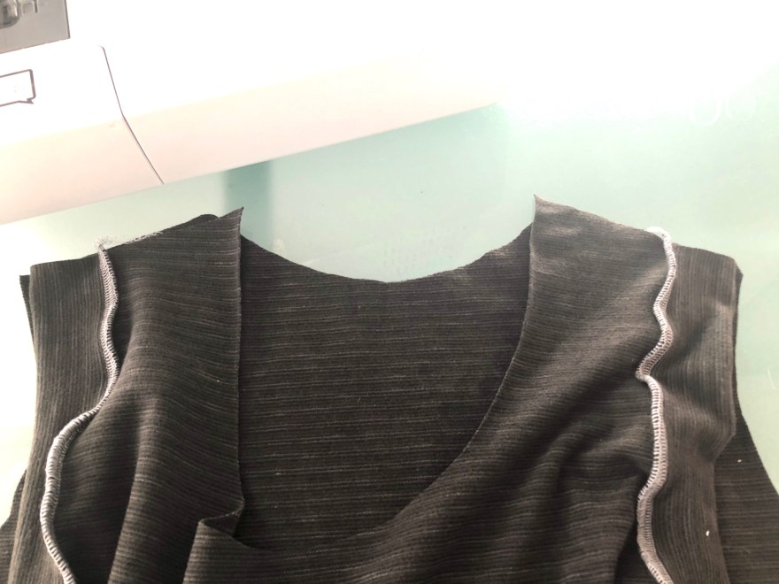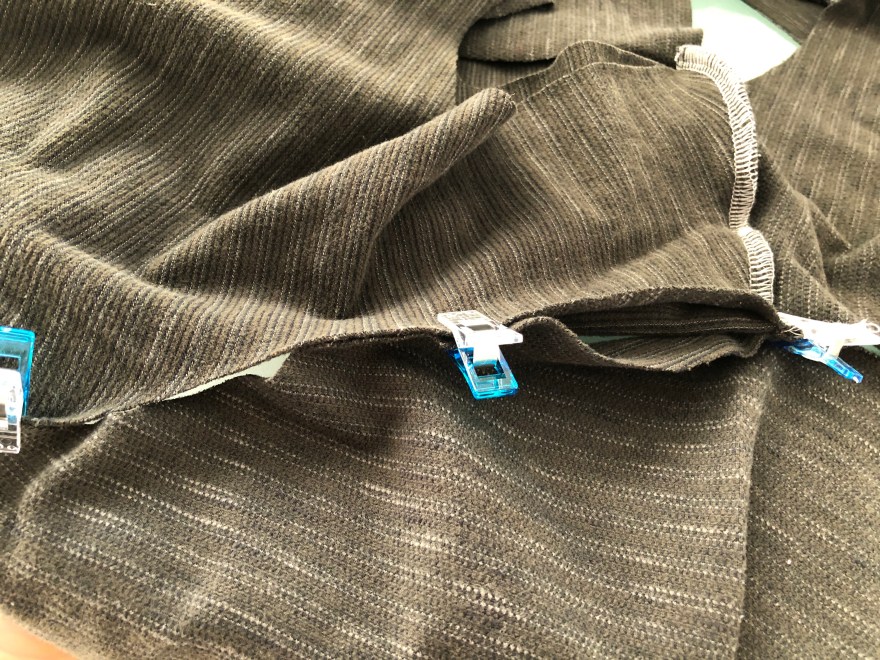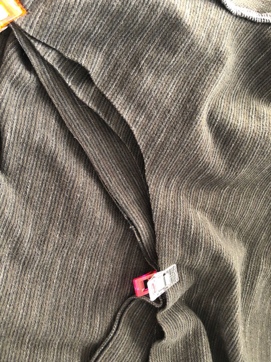 Next attach the bands along the arms of the long front piece. Again, fold the band so wrong sides are together, and place the band on top with the right sides together. Do not stretch for the first 5″. Then try to stretch it evenly until you get to the little mark you made (mine was in chalk).