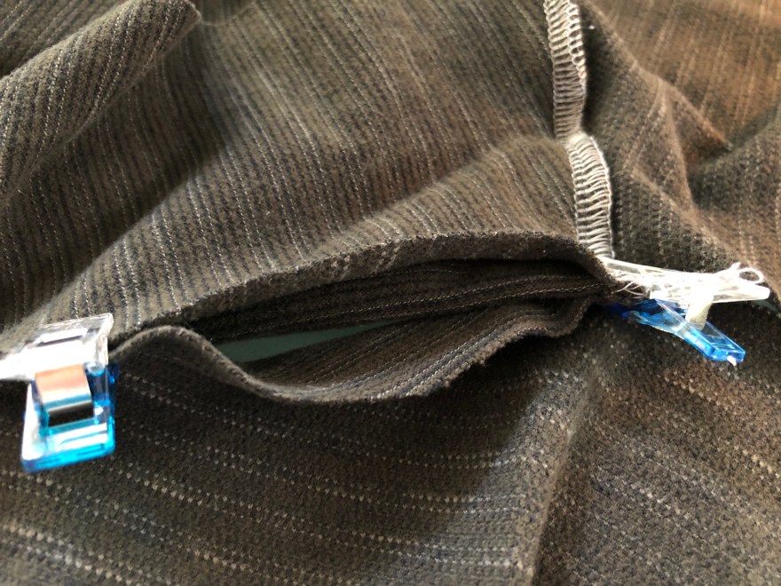 Now line your side seams. I like to start with the long front piece. Line up the bottom of the long front piece and the bottom of the back piece. Don’t stretch either, place a clip where the front piece is banded (you will want the end of the band to hang off a bit so a triangle shape will get cut off when serging). Now line up the nursing under layer. Starting from the armcye without stretching the back or the front pieces line them up. The long front piece and the nursing under layer bands should overlap slightly.