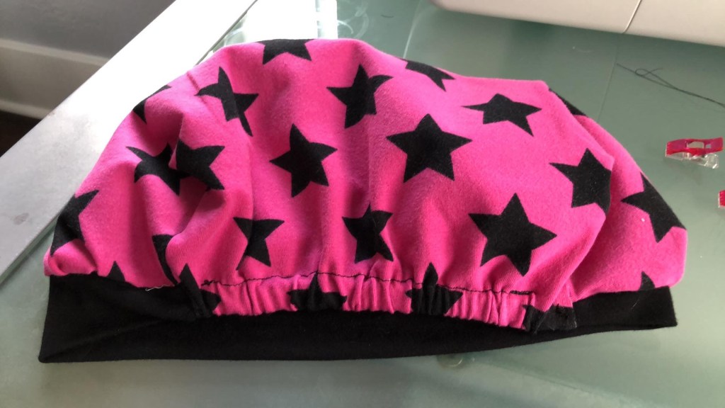 I know my selfies aren’t there normal quality but #weridtimes. So the one I’ve actually added a little (BIG) detail from the one I posted above…. BUTTONS for the elastic from the face masks because the health care workers are working such long hours so often the skin behind their ears is starting to break down so this allows them to put the elastic around the button and save their ears. Also I’m using knit (stretch) fabric where the original pattern was drafted for woven (non stretch). To adjust for the stretch I took 1.5″ out of the band (the black piece) other then that I used as is, and it works great!