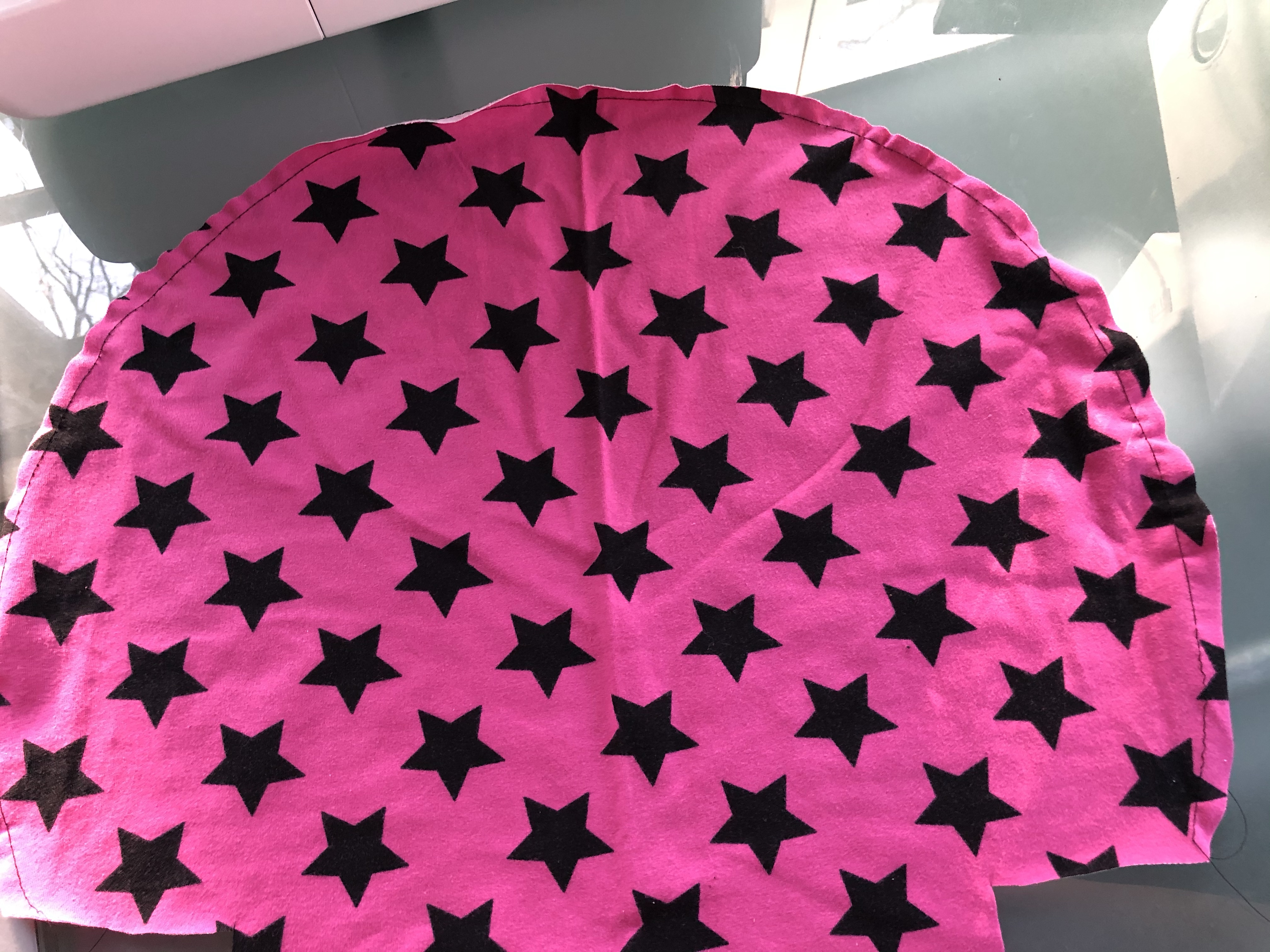 First step (which is different the patterns directions) is gathering the rounded part. Set your machine to the longest straight stitch then just stitch along the rounded side.