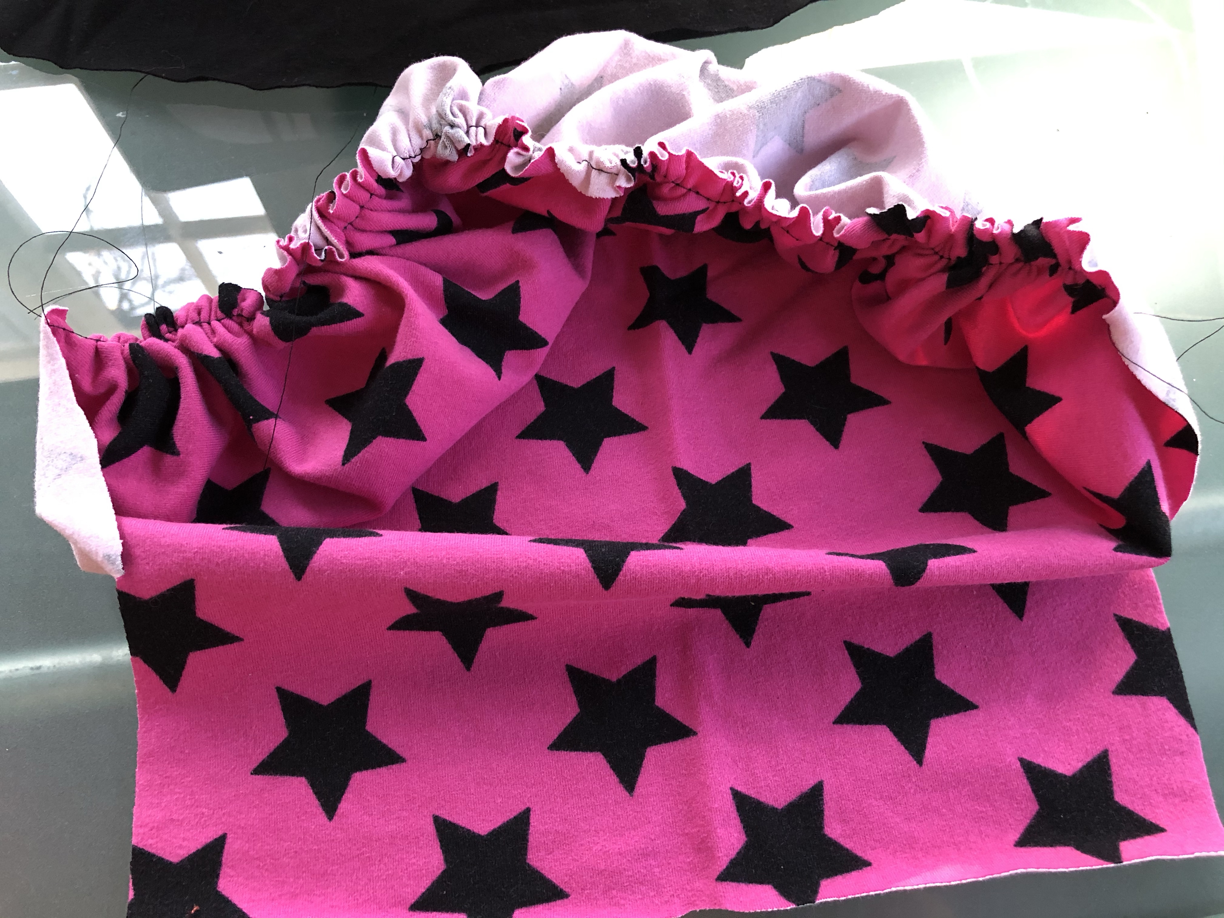 Do this on both sides, be sure not to twist your elastic. It should look like this. Now you make the casing for the elastic. (and then your done!) You can also not add the elastic in the above step and make the casing first then thread the elastic through and stitch it down on the sides, but I find this saves a step or two.