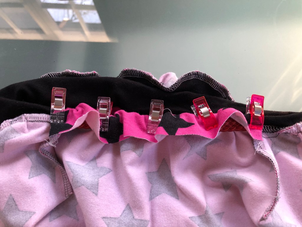 Then line up the gathered edge with the folded band. Adjust your gathers accordingly. You can use more clips/pins if you need, I plan on making a lot so I just clip minimally to save time. I’m going for good enough not perfection.