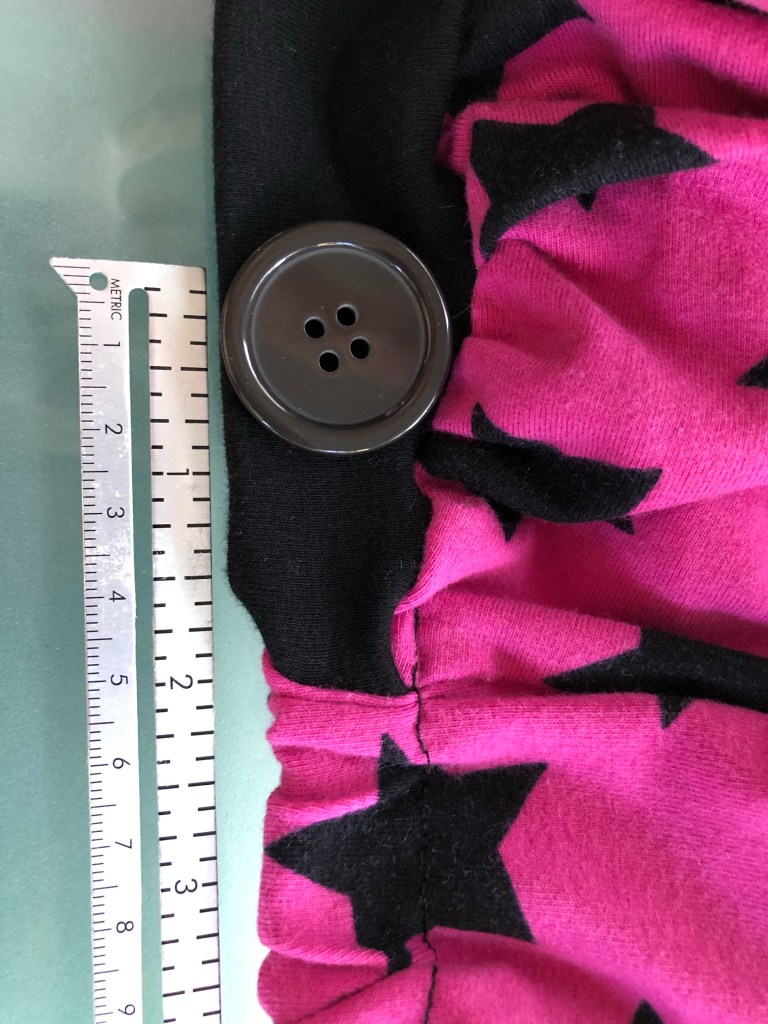 Use buttons that are at least 3/4″ in size. Place them about 1.5″-2″ from where the band and elastic meet. You want the button by the ear, not the temple so that it doesn’t pull the mask into their chin/away from their nose. You want it to pull just like it would if they were wearing it around their ear.