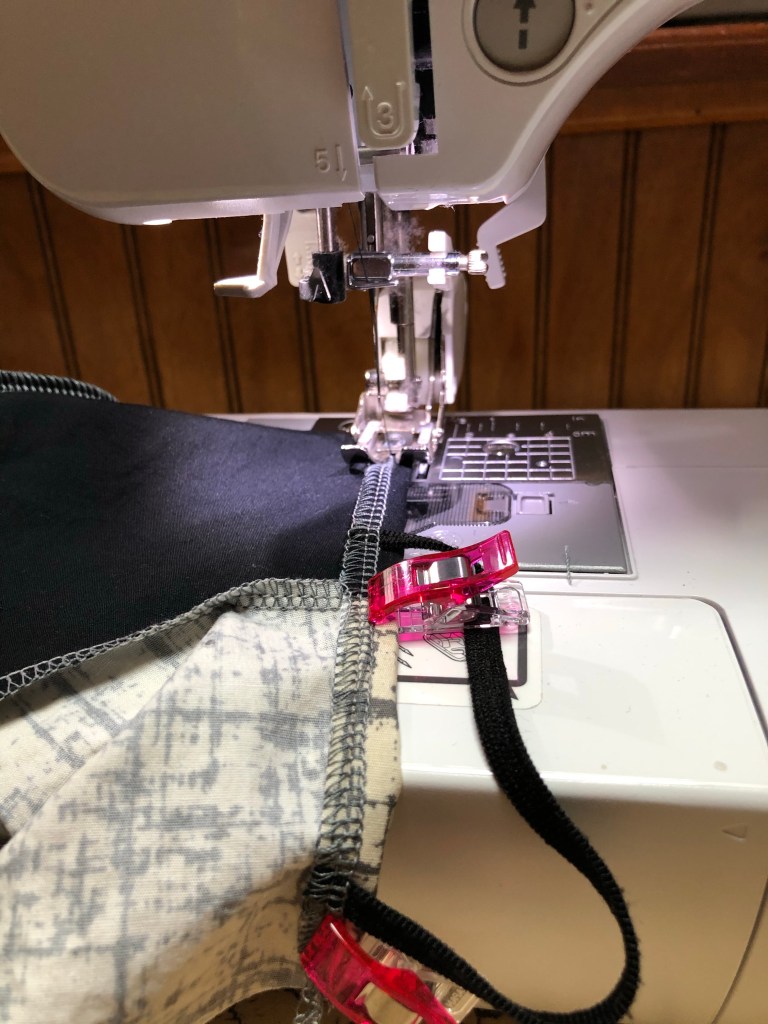 On your open side you will be putting the elastic inside – between the two fabrics – and stitching it closed. I placed the elastic ontop to show you what it will look like inside.