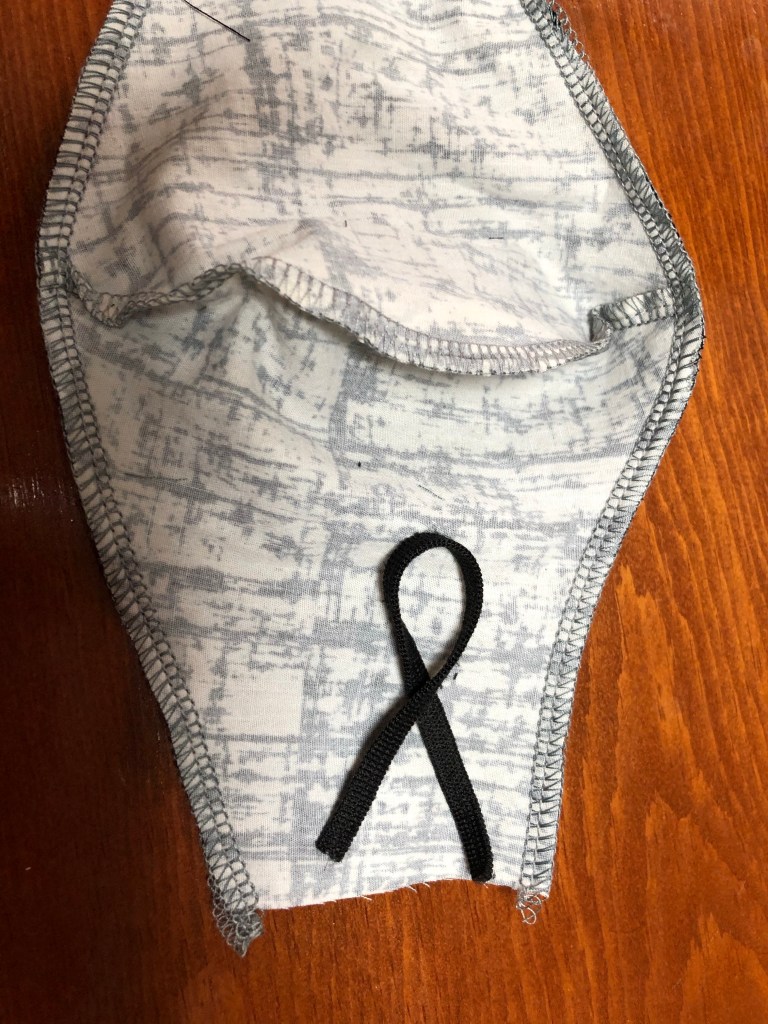 Then open this up and align one elastic along one edge. Place the elastic so its closer to the bottom of the first fabric and closer to the top of the second fabric. This way it spaces out the elastic on each side which will keep the pocket from gaping open either way you wear the mask.