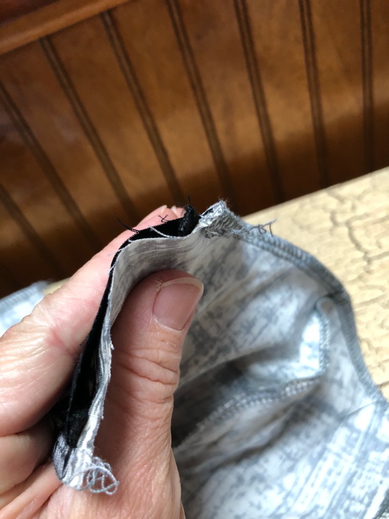 Last step is turning your mask right side out, push all the seems out so there isn’t any bunching then top stitch. Start at one opening by the filter and go all around your mask. Pick up your pressure foot when you get to the corners to make a nice clean corner.