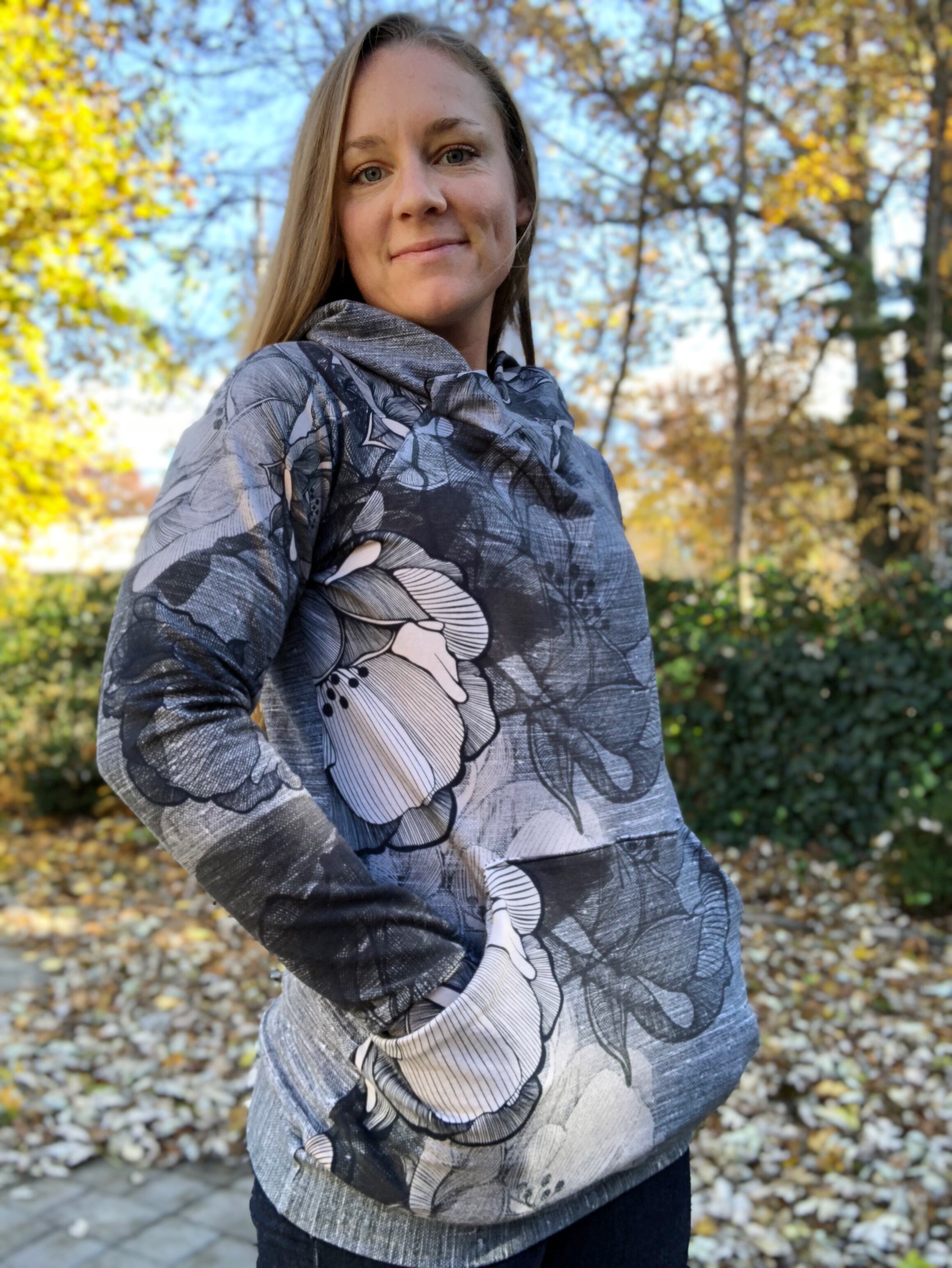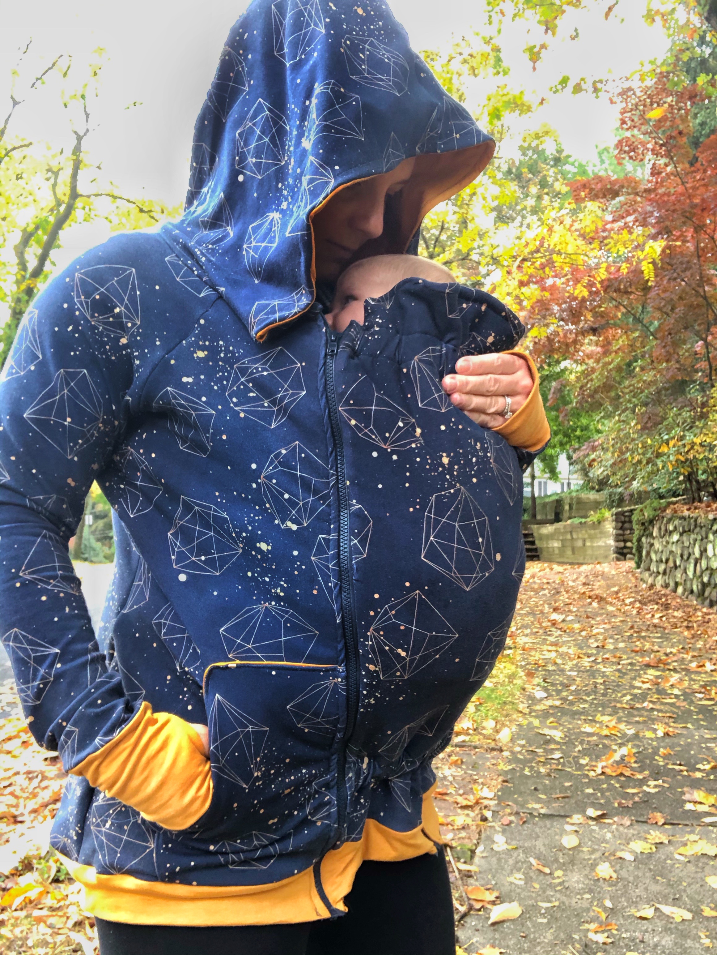 I hate the cold, and I am also lazy… ok let me reframe that, since that is not entirely true and I want to practice being kind to myself. I am incredibly busy with a four year old and a newborn so I often try to cut corners. Including bundling up, but then theres that little (big) fact that I hate being cold…. So I decided to make a two-fer hoodie. One hoodie that goes around myself and baby (and since she LOVES being in her carrier and we walk ALL.THE.TIME. I figured it was worth the time and effort to make it).